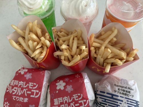 いつも同じでは芸がないので、期間限定のとちおとめ白桃のマックフロートと瀬戸内レモンタルタルベーコンてりたまを選択。