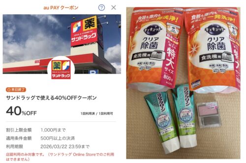 au PAYで三連休限定で使えるサンドラッグの40%オフになるクーポンが配布されています。