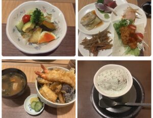 秋刀魚の塩焼き、アジフライ、牛のあみ焼き、天丼。