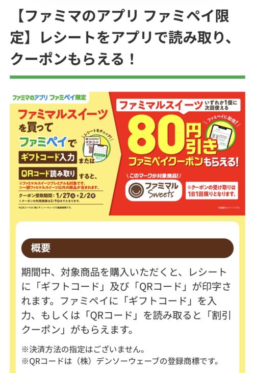 ファミマルスイーツを買ってギフトコードを入力すると、80円引きクーポンが届きます。